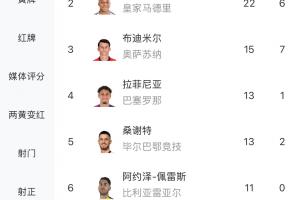 西甲射手榜方面,莱万23球领跑,姆巴佩22球第二。