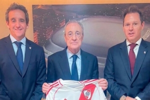 布里托与皇马主席弗洛伦蒂诺合影,并向后者赠送了河床球衣。