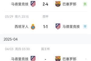 之后马竞的下一场比赛,又正是国王杯的半决赛,他们将对阵巴萨。首回合两队4-4战平,上个月西甲马竞2-4告负。