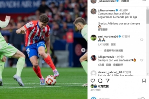 马竞前锋阿尔瓦雷斯社媒晒出比赛照片,配文:“我们拼到了最后,我们将继续为联赛而战。感谢马竞球迷一直以来的支持。”