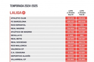 体育资讯2月19日讯 西甲官方在冬窗后更新了更新的各队工资帽,皇马7.55亿欧居首,巴萨4.64亿欧第三。