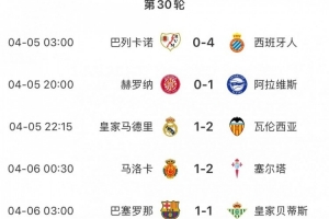体育资讯4月8日讯 西甲第30轮比赛已经全部结束,本轮10支主场作战的球队3平7负无一胜绩。