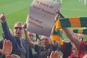 卡尼在德比战中举牌抗议:“我坐在这里的时候,你还没出生。”以及“74年忠诚支持——为了什么?”