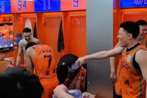 赛后,上海球员在更衣室疯狂庆祝,泼水哈维。