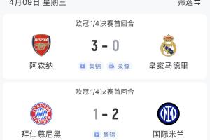 欧冠1/4决赛打响,首回合皇马0-3客负阿森纳面临出局,国米2-1拜仁占得先机,巴黎、巴萨将在明天出战。