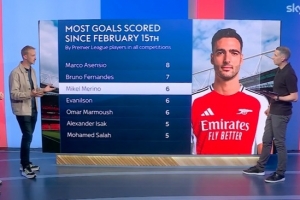 据统计,自今年2月15日梅里诺出任中锋以来,他在各项赛事已经为阿森纳打进6粒进球,此数据在同期所有英超球员中并列第三位,具体榜单如下: