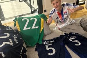 马蒂奇赛后晒儿子菲利普与众多球衣的合照,包括卢克-肖、阿玛德、马奎尔的球衣,最显眼的是一件门将的22号球衣。
