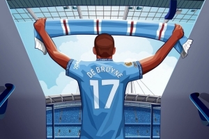 曼城官方社媒晒出海报,内容为身穿德布劳内球衣的球迷举起曼城围巾。