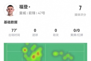 体育资讯2月20日讯 曼城在本轮欧冠附加赛次回合0-3落后皇马,福登本场数据如下: