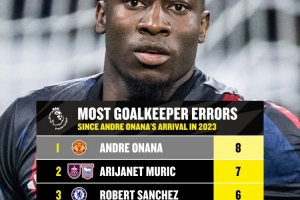 体育资讯4月13日讯 据多家英媒报道奥纳纳今晚没进曼联的大名单,对此,英媒talksport统计了自奥纳纳2023年加盟曼联以来英超的门将失误榜 ,其中奥纳纳以8次失误登顶榜单。