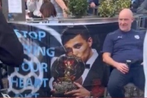 赛前,西班牙六台的直播画面显示,曼城球迷把罗德里金球横幅带到了马德里,还加上了维尼修斯哭泣的表情。