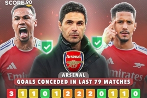 体育资讯4月14日讯 Score90统计表明,阿森纳已经连续78场比赛没有丢3球了。
