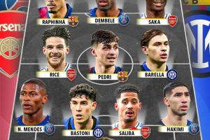 詹俊在社媒写道:外媒选出的本季欧冠四强球员最佳阵容。最难选的恐怕就是右边锋,萨卡本季欧冠5球2助攻,亚马尔则是4球3助攻,不相上下..............
