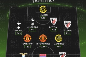体育资讯4月18日讯 欧联杯1/4决赛次回合比赛全部战罢,数据网站Whoscored盘点了本轮比赛评分最高阵容,其中切尔基领衔锋线、B费、卡塞米罗在列,具体如下: