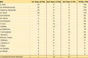 目前流出的20位投票者,约基奇、亚历山大、字母哥和塔图姆,都获得了全票。