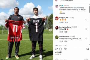 体育资讯4月19日讯 NFL官方社媒晒出一张橄榄球球星贾马尔-蔡斯与AC米兰球员普利西奇的合影,双方还交换了各自球衣。
