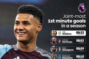 据英超官方统计,英超本赛季出现10粒开场1分钟内的进球,追平2022-2023赛季创造的纪录。