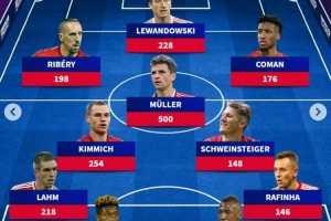 拉姆(218场)、阿拉巴(255场)、博阿滕(209场)、拉菲尼亚(146场)