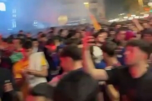 众多巴萨球迷来到巴塞罗那卡纳雷特斯喷泉(巴萨庆祝常用场地),庆祝球队夺冠。