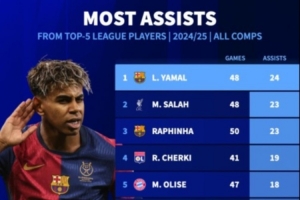 体育资讯4月28日讯 德转列本赛季五大联赛球员各项赛事总助攻榜,亚马尔24次居首,萨拉赫、拉菲尼亚均23次。