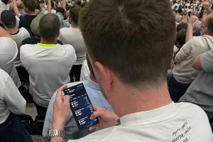 热刺半决赛首回合战胜博德闪耀的比赛中,一名球迷正在查看机票价格