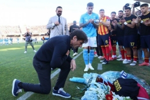 随后孔蒂向菲奥里塔的球衣献花,并单膝下跪表示哀悼。莱切主场球迷们为孔蒂的举动送上了掌声。