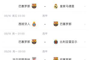 接下来巴萨还将为西甲冠军而奋战,他们目前领先第2的皇马4分。下一轮巴萨正是在主场迎战皇马。而最后3轮,巴萨还将面对加泰德比西班牙人,西甲第5比利亚雷亚尔,西甲第4毕尔巴鄂竞技。