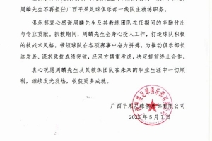 经俱乐部研究决定,并与周麟先生本人友好协商一致,即日起,周麟先生不再担任广西平果足球俱乐部一线队主教练职务。