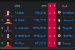 体育资讯5月9日讯 据StatMuse FC的数据统计,本赛季欧洲五大联赛,已经有5名球员贡献单场2球+2助攻,最近一次是费尔明-洛佩斯。