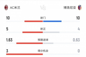体育资讯5月10日讯 本轮意甲,米兰主场3-1逆转博洛尼亚。双方此役重点数据对比如下↓