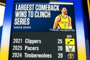 本场比赛,步行者最多落后过骑士19分,但他们后来居上翻盘晋级。