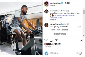 吕迪格已经恢复室内训练,他在社交媒体上晒出健身房内训练的照片,配文:“恢复,一天一天,一步一步。”