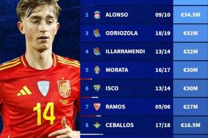 附皇马引进西班牙球员转会费Top10(格式:球员名,此前效力球队,赛季,转会费):