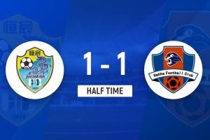 上半场比赛结束,梅州客家1-1广西恒宸 。