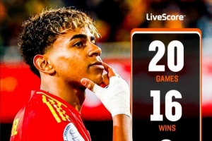 据LiveScore的数据统计,在代表西班牙出战的正式比赛中,亚马尔还未尝败绩。