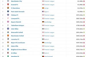 体育资讯06月09日讯 德转最新一期身价更新后,足坛俱乐部身价排名发生变化,最新身价前20的俱乐部如下(单位:欧元):
