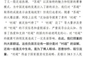 但我们也看到,随着“苏超”的火爆出圈,网络上出现“足协指导搅黄了贵州‘村超’”、“‘村超’被足协叫停了”、“‘村超’没了”等大量涉及贵州“村超”的不实信息和虚假谣言,严重误导公众认知,伤害了热爱和支持“村超”的国内外球迷网友的心,对“村超”的健康可持续发展造成了一定负面影响。