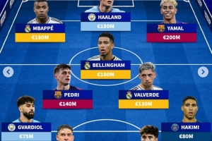 前锋:姆巴佩(皇马/1.8亿欧)、哈兰德(曼城/1.8亿欧)、亚马尔(巴萨/2亿欧)