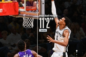 文班隔扣布朗尼!这一扣球的最高高度3.4米 文班滑翔距离2.2米!