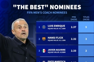 最佳教练候选上赛季成绩:恩里克5冠、弗里克3冠、阿尔特塔0冠