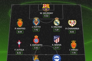 whoscored本轮西甲最佳阵:什琴斯尼领衔,米利唐、巴埃纳在列