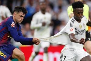 国家德比名场面维尼修斯社媒晒图,佩德里铆足劲儿拉他球衣