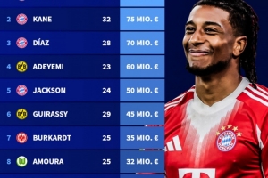 德甲进攻球员身价排行:奥利塞1.3亿欧居首,凯恩7500万欧次之